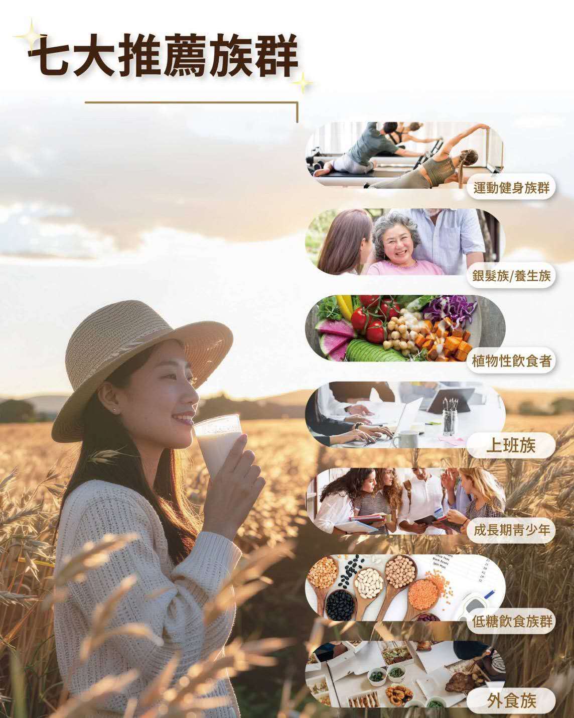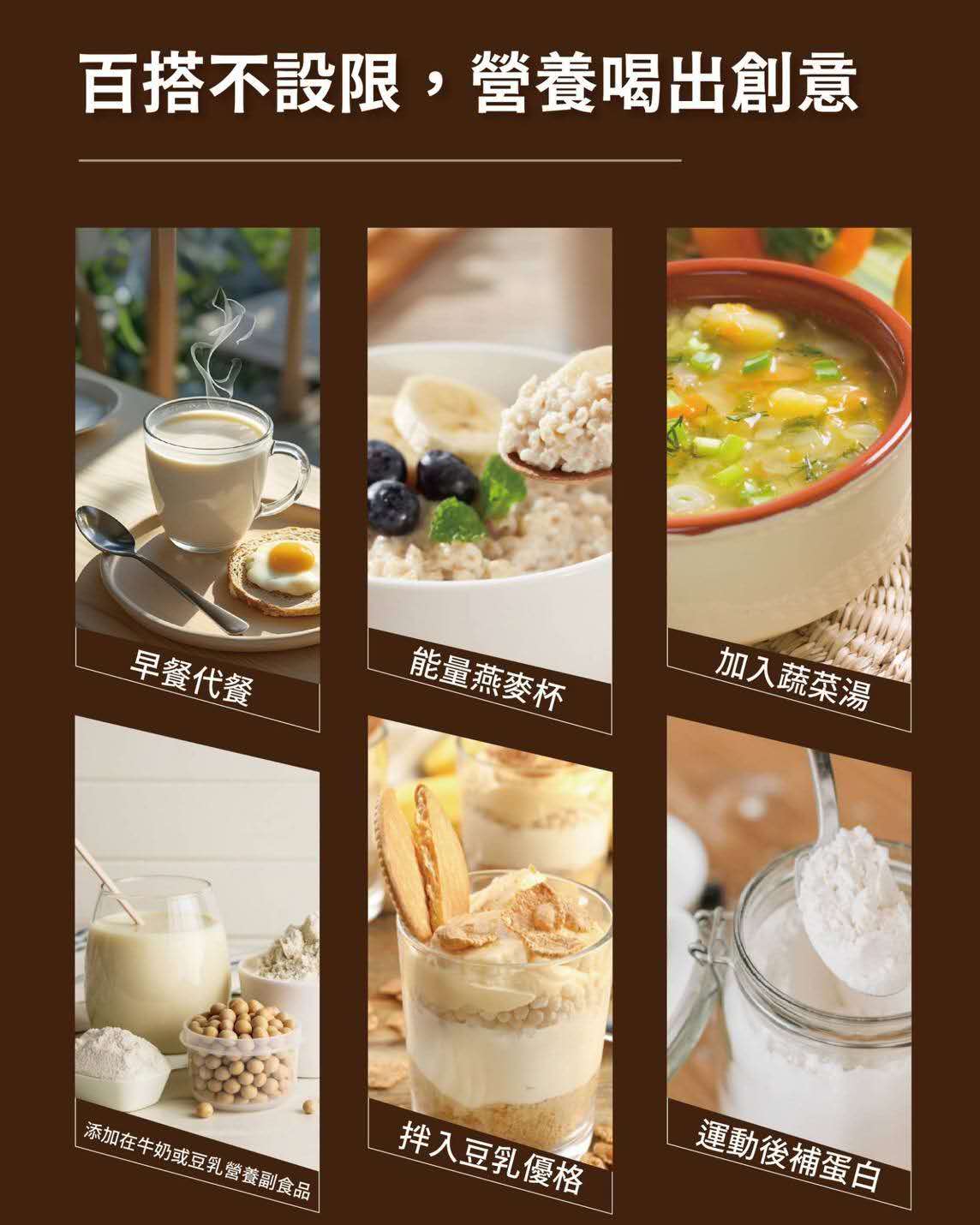 Powdered brown rice • Powdered NON-GMO soybean • Powdered oat • Powdered wheat germ • Powdered Job's tears • Powdered lotus seed • Powdered black bean