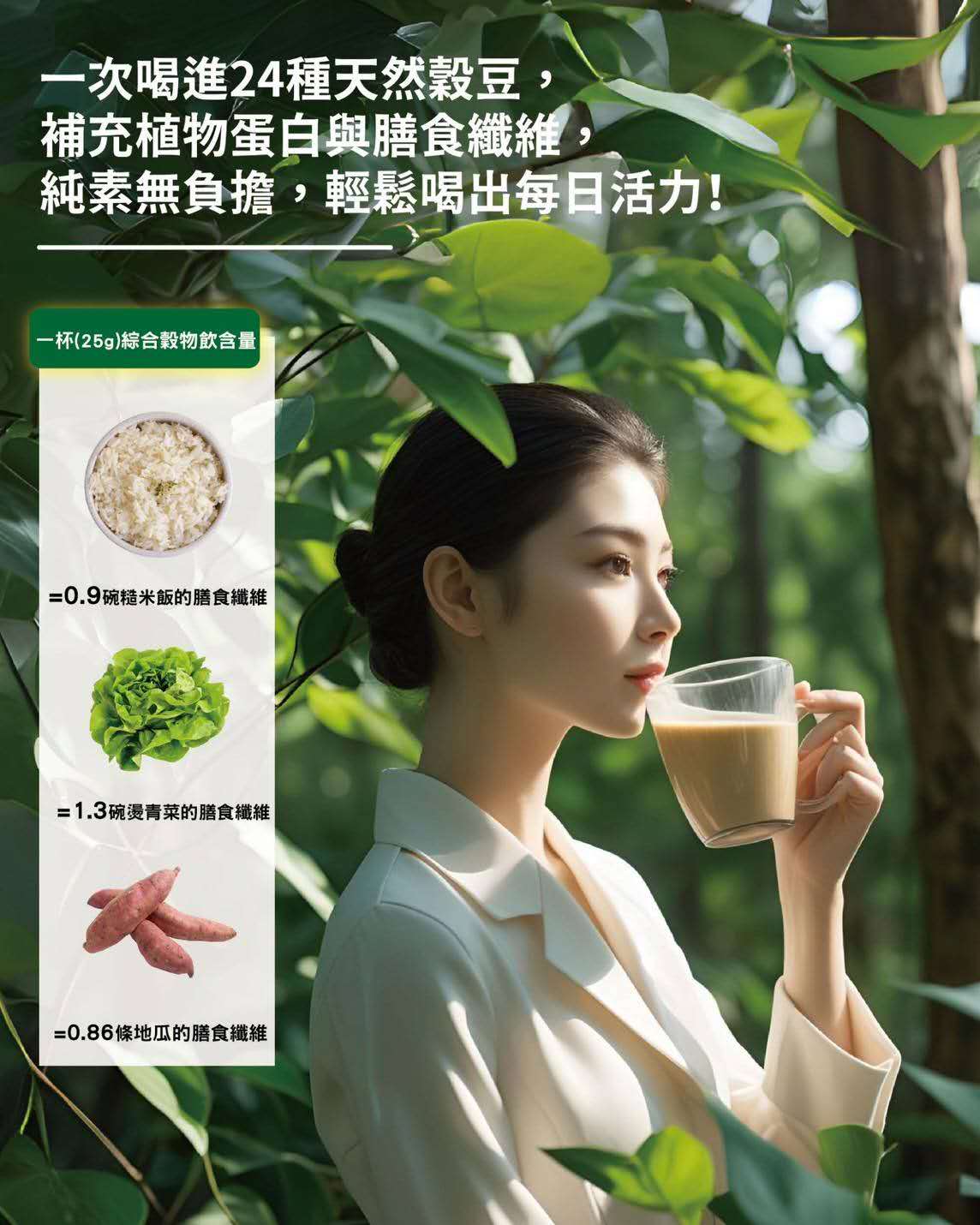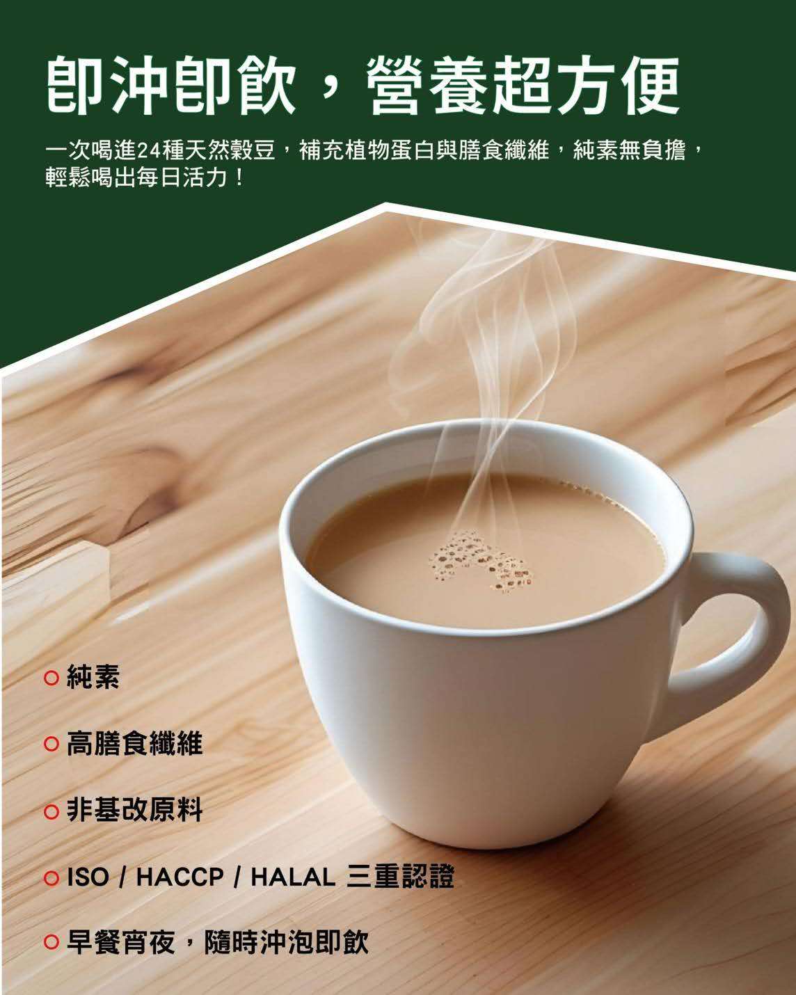 Powdered NON-GMO soybean • Sugar • Powdered brown rice • Powdered black bean • Corn starch • Powdered black sesame • Powdered buckwheat • Powdered barley • Powdered Job's tears • Powdered red bean • Powdered mung bean • Powdered rice bean • Powdered runner bean • Powdered pea • Powdered NON-GMO corn • Powdered pine nut • Powdered ginkgo • Powdered walnut • Powdered lotus seed • Powdered ophiopogonis tuber • Powdered Chinese yam • Powdered gordon euryale seed • Powdered poria • Powdered wolfberry • Powdered lily bulb • Powdered millet